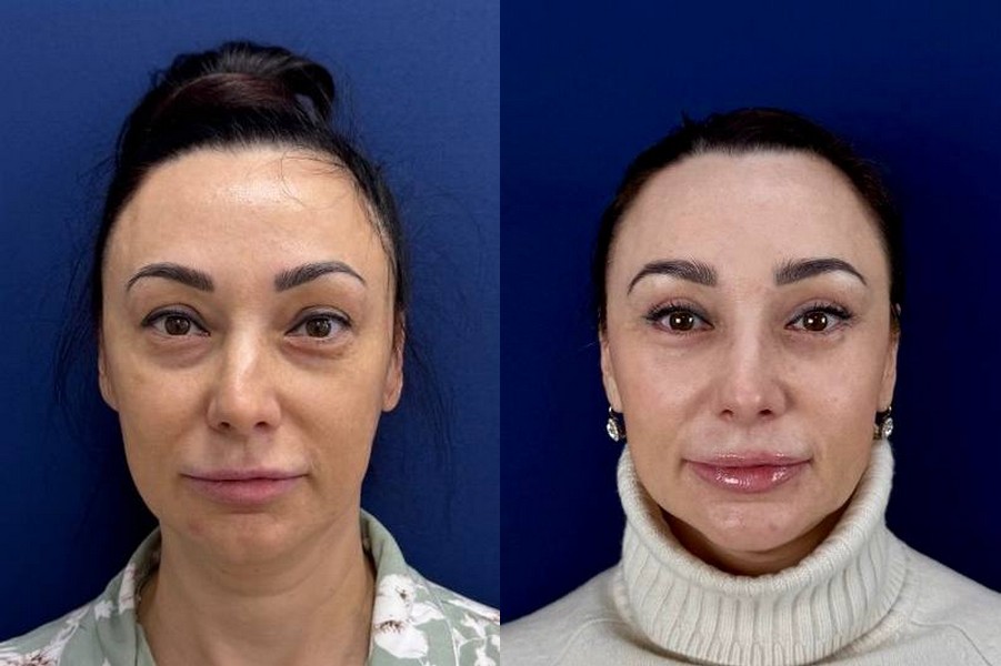 Выполнена верхняя блефаропластика, ограниченная подтяжка средней зоны лица (или расширенная нижняя Блефаропластика), липофилинг средней зоны
